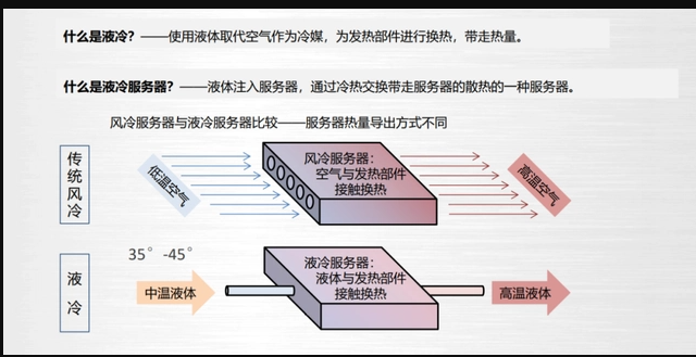 与传统的风冷技术相比,液冷技术优势显著,具体划分有以下:热量带走更多,同体积液体带走热量是同体积空气3000倍。温度传递更快,液体导热能力是空气25倍。噪音品质更好,同等散热水平时,噪音比风冷噪音降低15~30dBA。耗电节能更省,液冷系统比风冷系统节电30-40%。节省更多空间,单机柜功率密度极大提升,液冷机柜可以节省空间80%。
