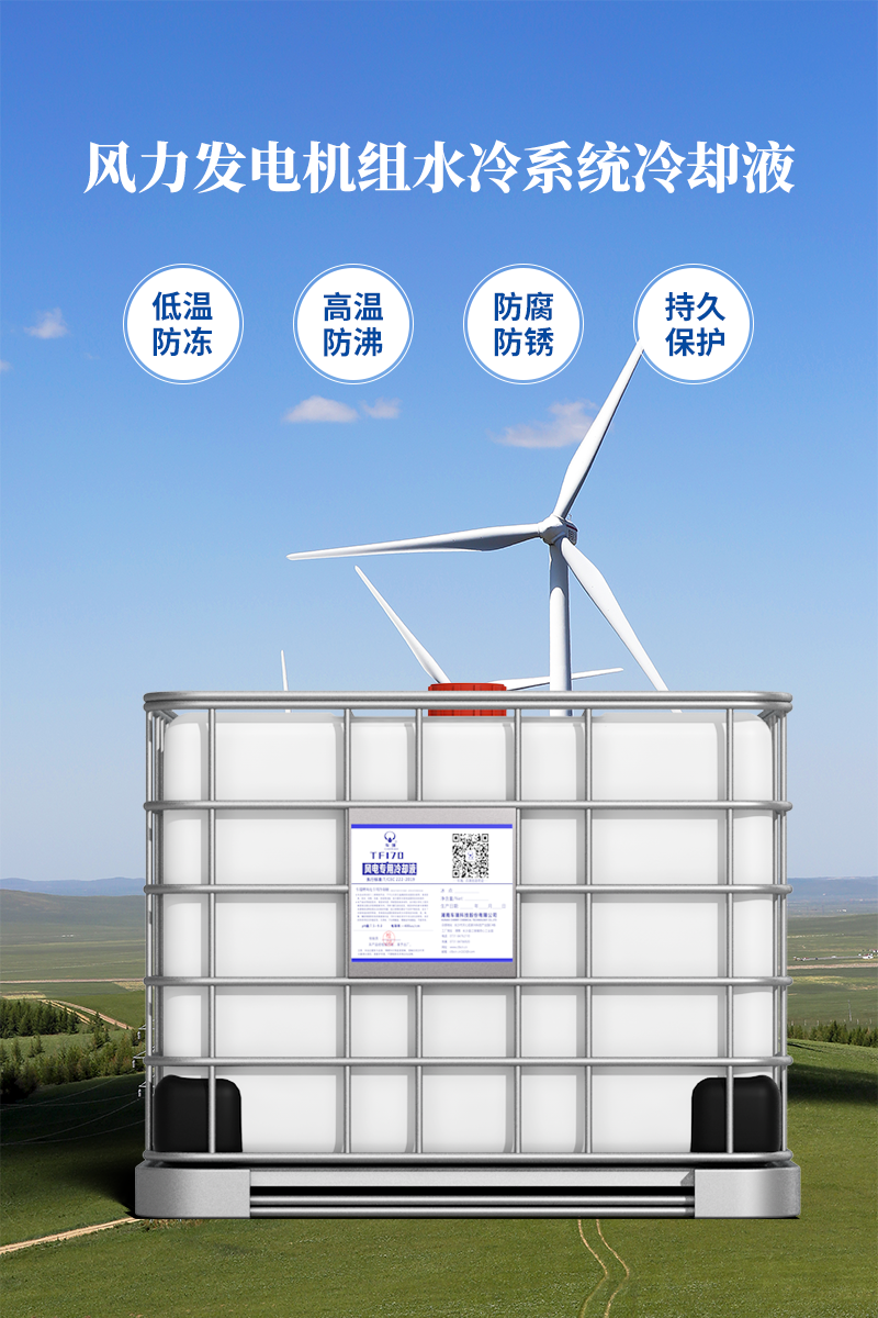 风力发电机冷却系统配套电导率感应装置,普通冷却液会触发报警装置引起停机;电导率过高还会引起较大的泄漏电流,从而使绝缘管路老化。TF170风电冷却液采用水为二级反渗透纯净水,电导率小于5µs/cm ;乙二醇采用优级品;所添加的助剂为有机添加剂,这样大大降低了冷却液的电导率,从而完全满足风电发电机组冷却系统特殊技术要求。
